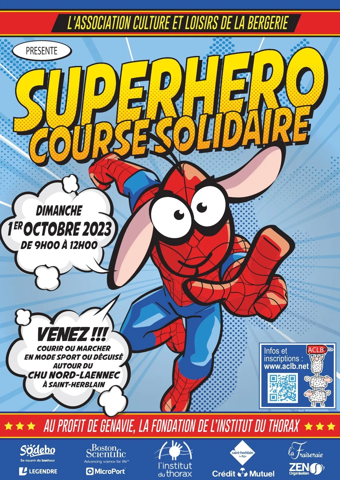 déguisé.e.s en super-héro.ïne.s ou en mode sport, sur le circuit de 2 km, pour la distance de leur choix et faire un don pour la recherche en santé.Ici, pas de dossard ni de frais d'inscription : il suffit de faire un don à l'ACLB qui reversera tous les bénéfices de la course à Génavie !